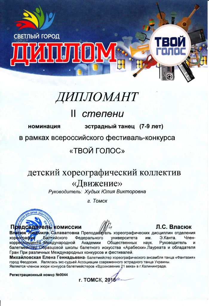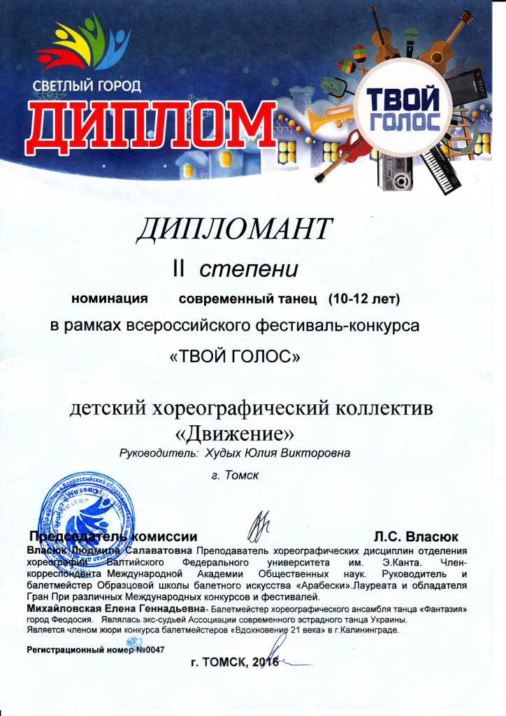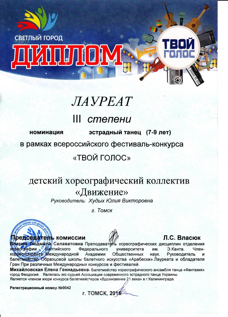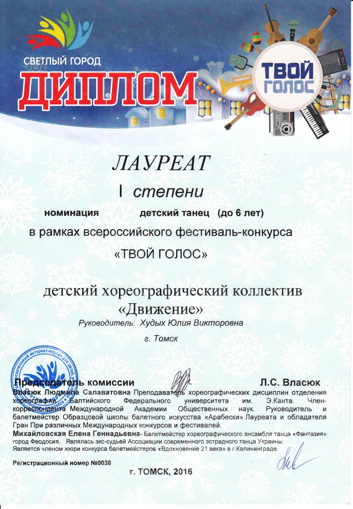 10 декабря 3 группы хореографического коллектива участвовали во Всероссийском фестивале конкурсе «Твой голос» все группы получили награды и дипломы а номер «Помощники деда Мороза» получил диплом лауреата 1 степени !!! Молодцы так держать. Отдельное спасибо родителям, за помощь в подготовке и организации такого марафона из 3 конкурсов подряд!!!